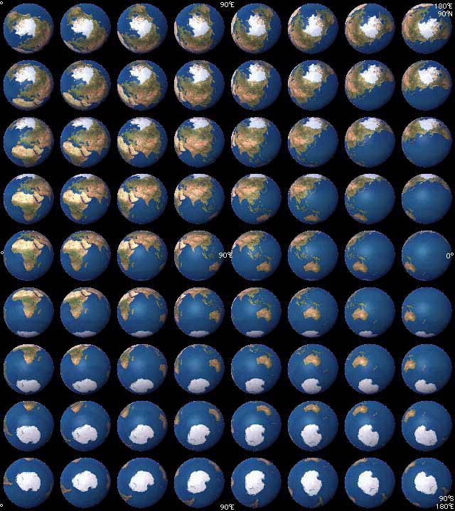 The thumbnails are arranged by longitude, left to right from 180 degrees West to 0 degrees, in increments of 22.5 degrees rotation. Latitude is arranged top to bottom from 90 degrees North to 90 degrees South, in increments of 22.5 degrees. Click here to view from 0 degrees longitude to 180 degrees East or scroll down this page. View sample image.